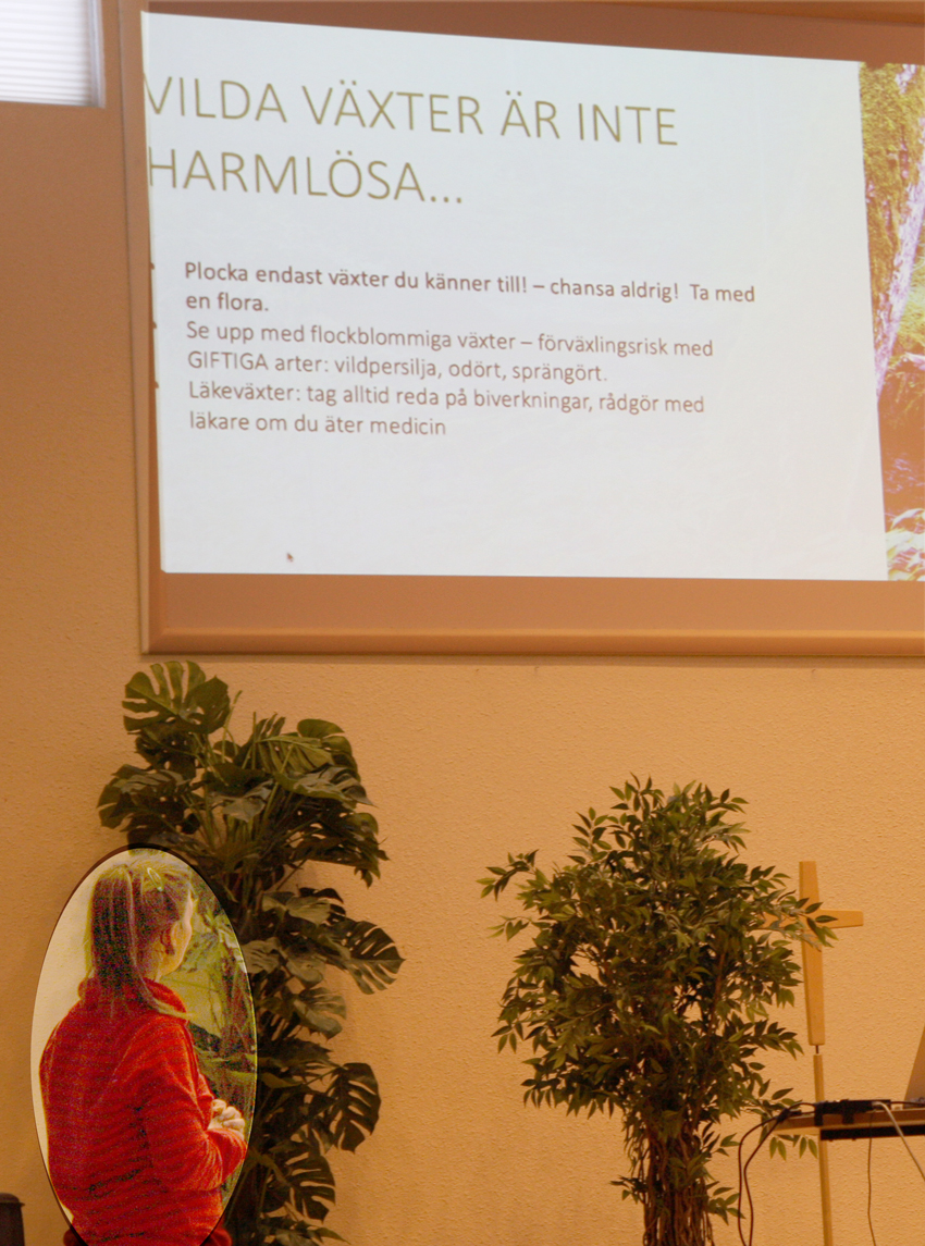 Helena berättade också om sju olika örter, som också kan användas, bl.a maskros, brännässla, älgört och daggkåpa. Mjölkörten/rallarrosen var enligt Helena en superväxt, allt på växten kan användas till saft, te, sallad eller bakverk. Helena nämnde hur både träd och växter använts som botemedel vid olika sjukdomar, daggkåpans blad användes till sårvård och rönnbärens C-vitaminer stärker immunförsvaret och rönnbärssaft användes vid blåskatarr. Men hon manade också till försiktighet. Till sist gav hon några praktiska råd när man skall skörda och sedan hur man förvarar och tillagar allt det goda från skogens skafferi. Helena Forsberg tackades med applåder och blommor för sitt intressanta föredrag.